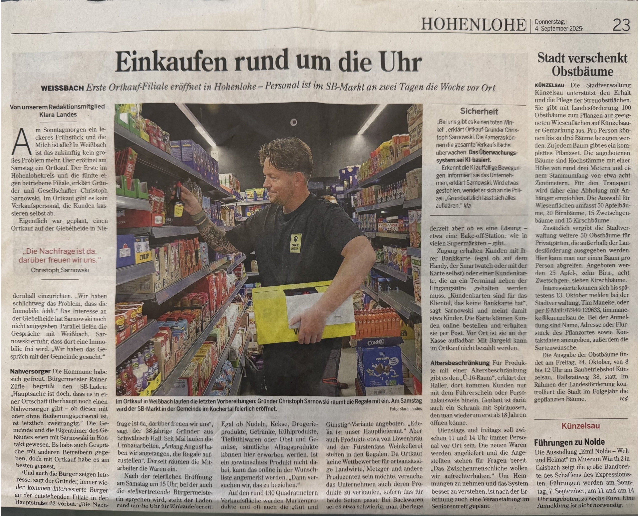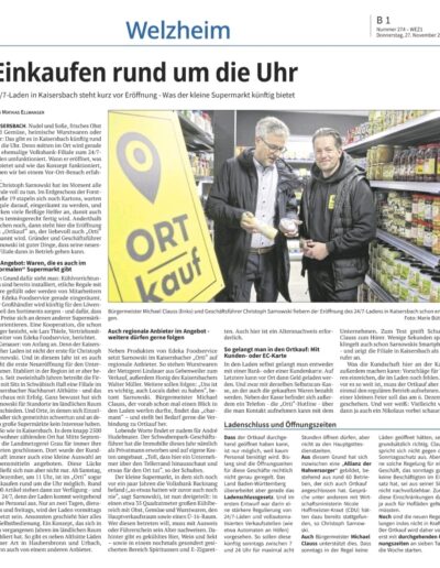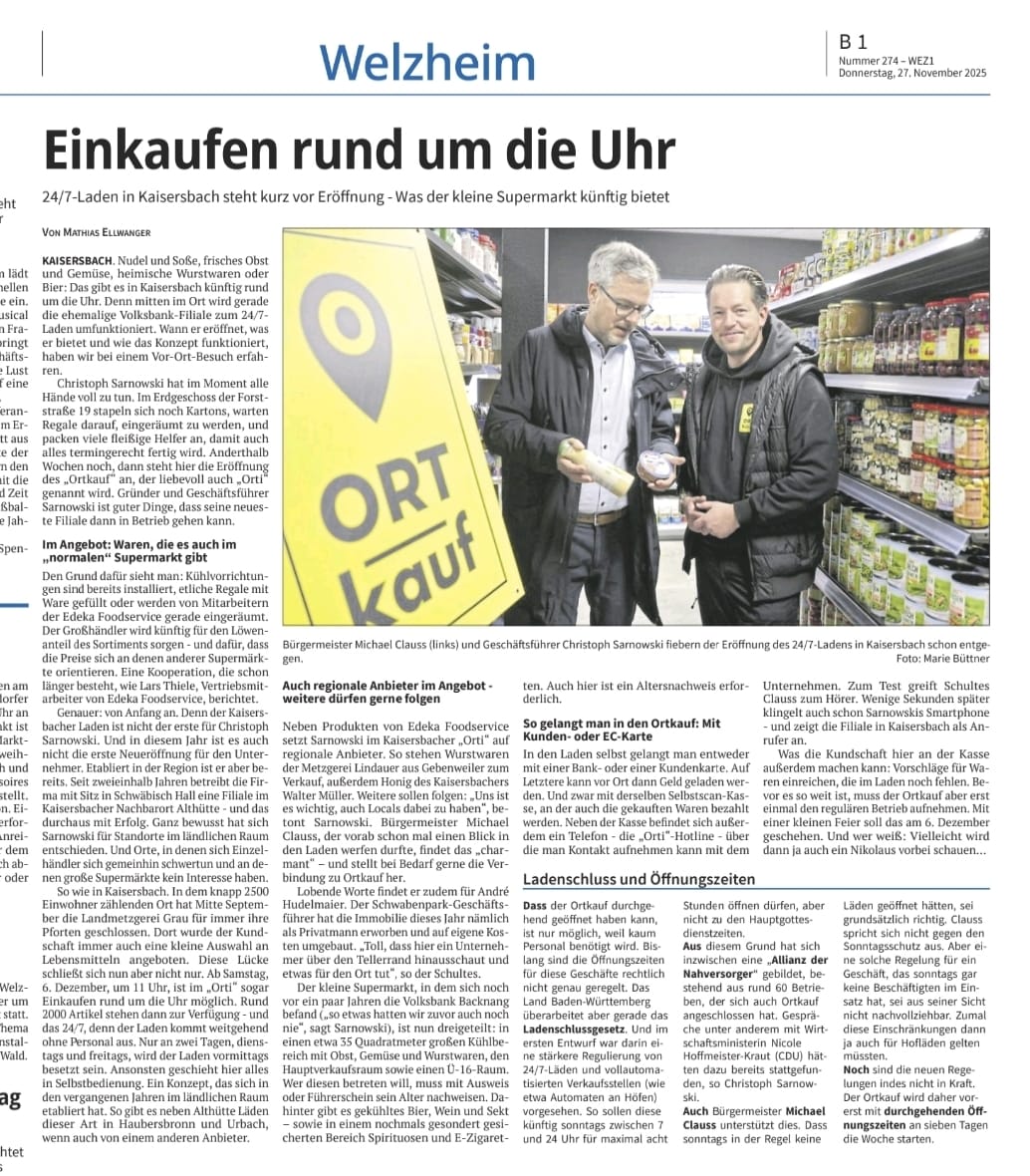 Kaisersbach, 6. Dezember 2025 – Am Nikolaustag hat ORTkauf seine sechste Filiale eröffnet. Mit dem neuen Smart Store 24/7 in Kaisersbach steht den Bürgerinnen und Bürgern nach der Schließung des bisherigen Nahversorgers wieder eine Einkaufsmöglichkeit für den täglichen Bedarf zur Verfügung. Nach vielen Gesprächen mit potenziellen Investoren und...